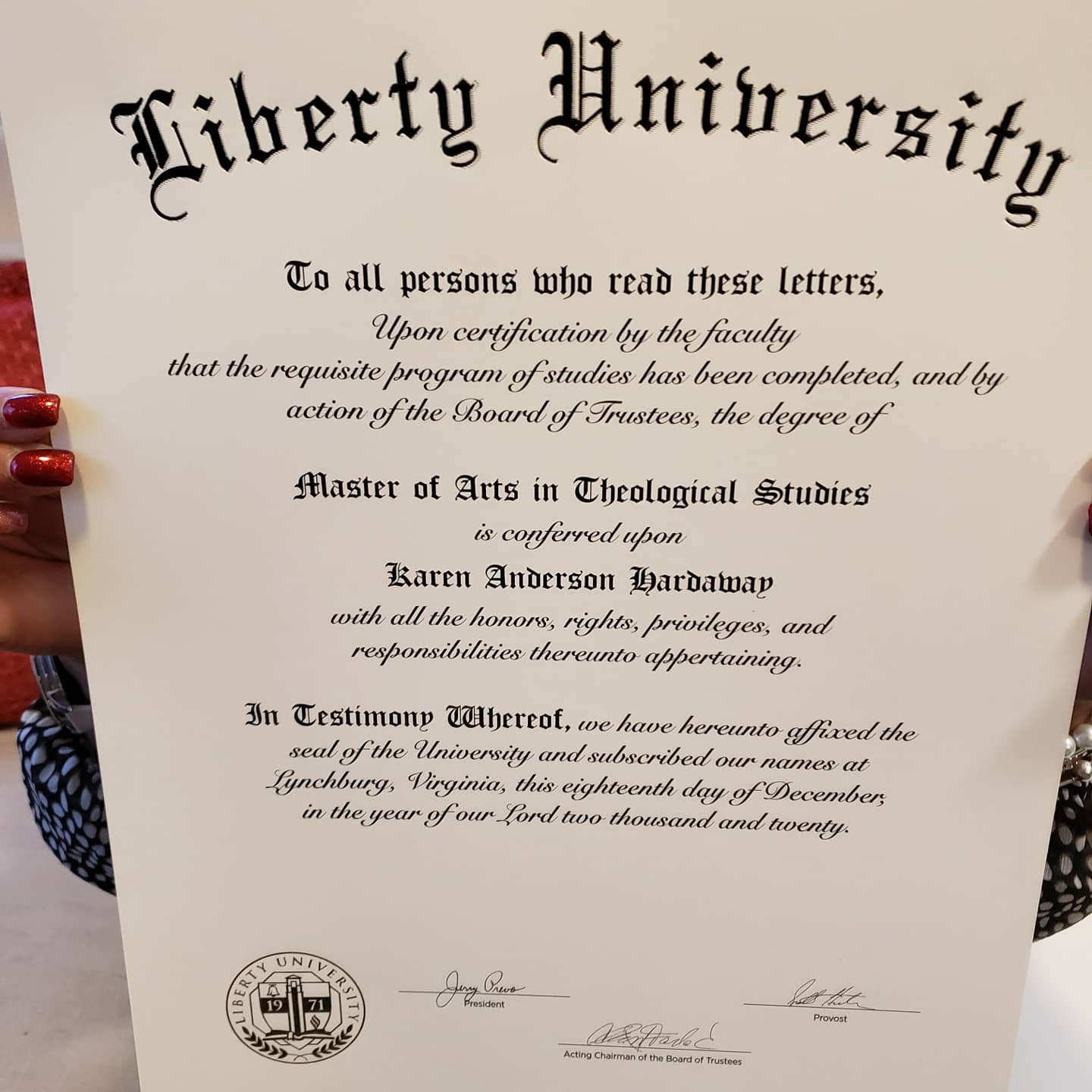 Dr. Hardaway graduated from high school in Pine Bluff, Arkansas, and has attended Virginia State University and Westchester Community College, majoring in Business Administration. She earned an Associate in Religious Studies from Andersonville Theological Seminary of Camila, Georgia. However, her latest academic achievements are earning a Bachelor of Science degree in Religious Studies, magna cum laude (2018) and a Master of Arts Degree in Theological Studies (2020) from Liberty University. In November 2023, she completed all the requirements to earn her Doctor of Ministry. Dr. Hardaway has studied to show herself approved by God to edify His kingdom.